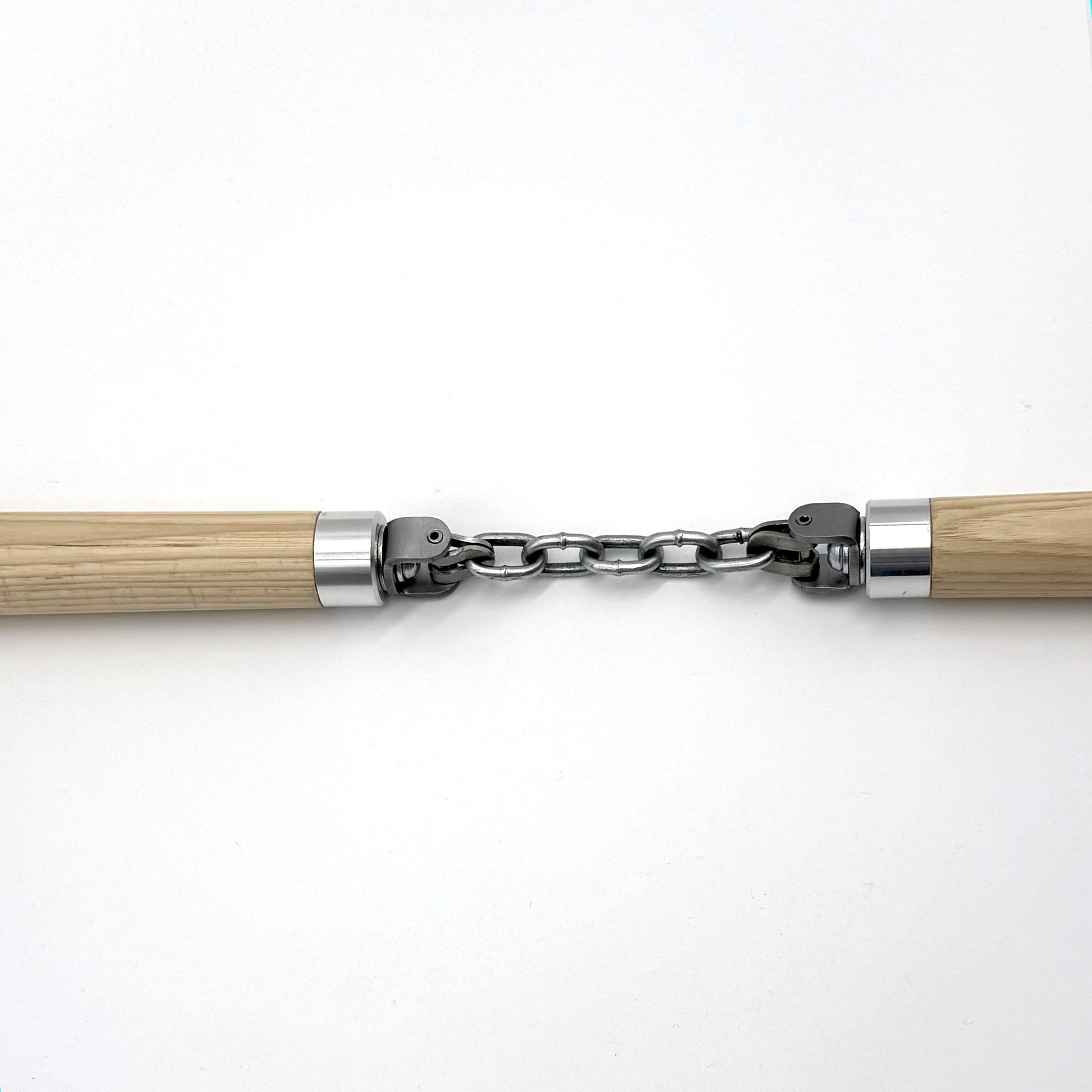 Our standard nunchaku is based on the original from Dolan Sports, circa 1978. The joint consists of steel chain and hardware, with aluminum end caps to reduce weight. The king pin is 2” in length. Five chain links provide 3.75 inches of separation, pin to pin. Each of the 12” handles are hand turned on a lathe, and are tapered from a 1” diameter at the cap to about 1.25” at its widest. Two or more coats of wipe-on polyurethane protects the wood from moisture and provides a uniform grip.
